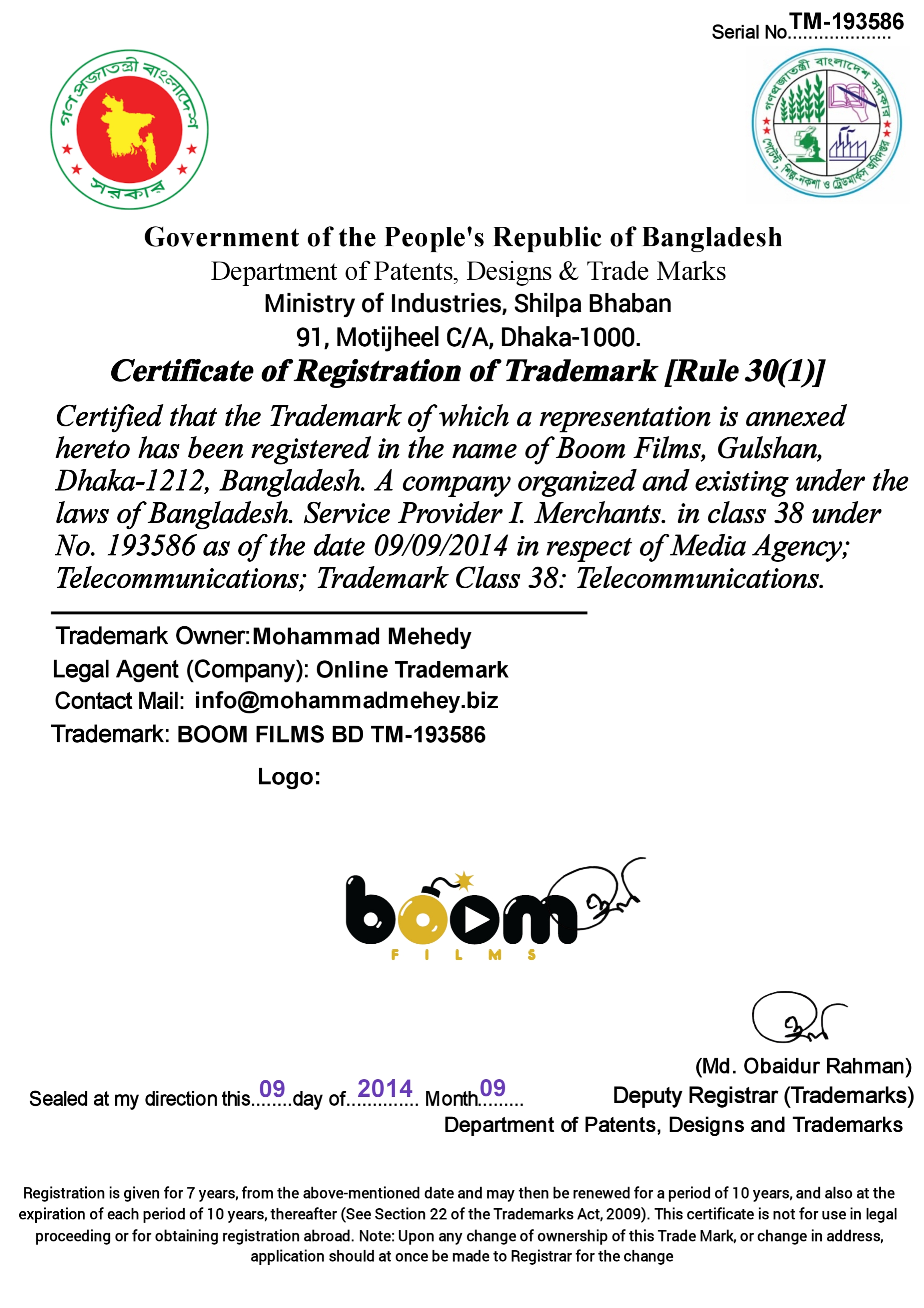 | Issuing Authority | Department of Patents, Designs and Trademarks (DPDT), Ministry of Industries, Bangladesh |
